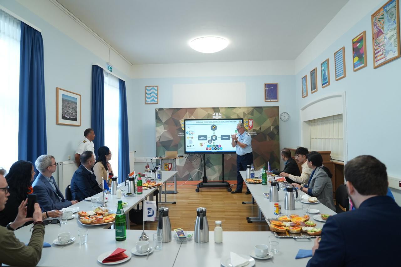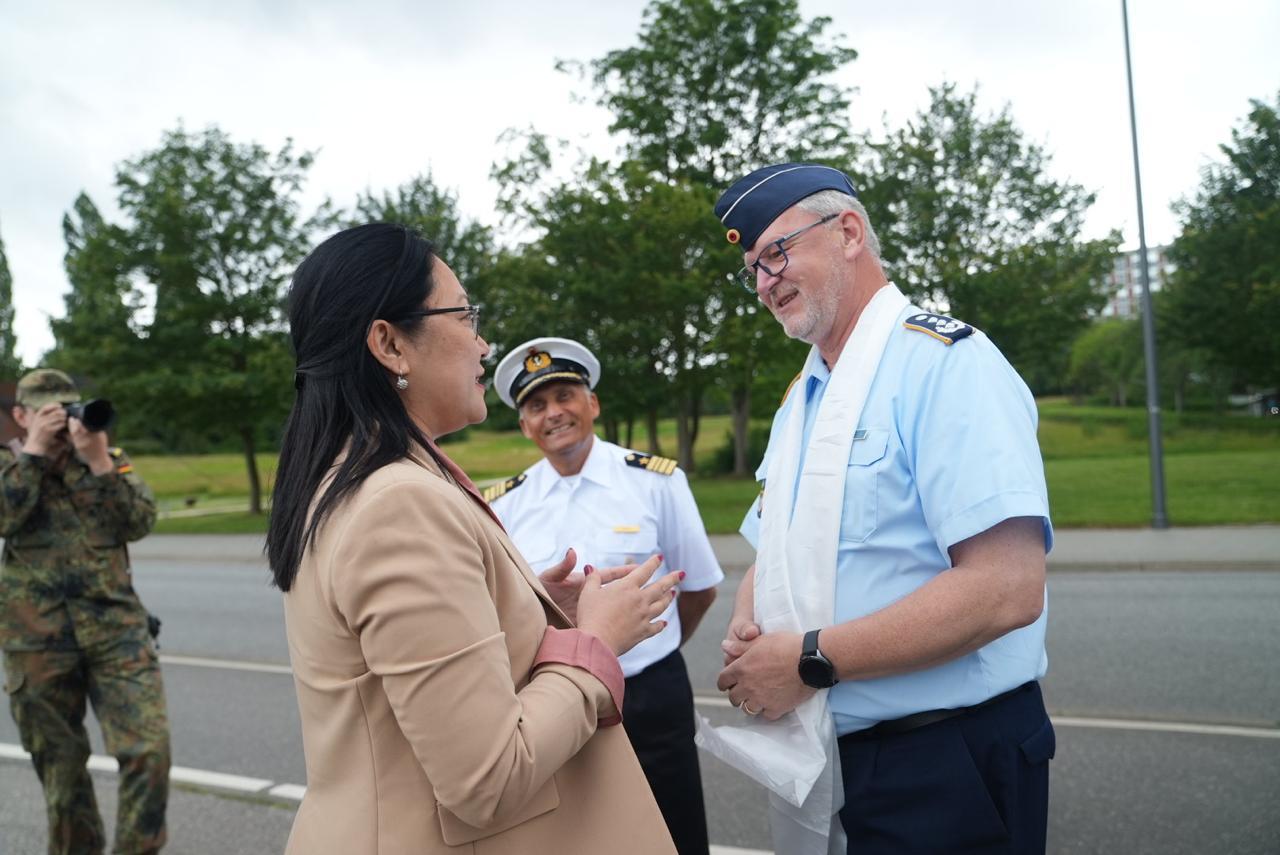 诺增卓玛部长及代表团成员访问期间,首站造访了位于基尔的西奥多·施特尔策军营(Theodor-Steltzer-Kaserne),指挥官米夏埃尔·斯卡梅尔上校(Colonel Michael Skamel)和德国海军总司令法兰克(Frank)提供简报并展开交流,展现了重要的军事与外交互动。