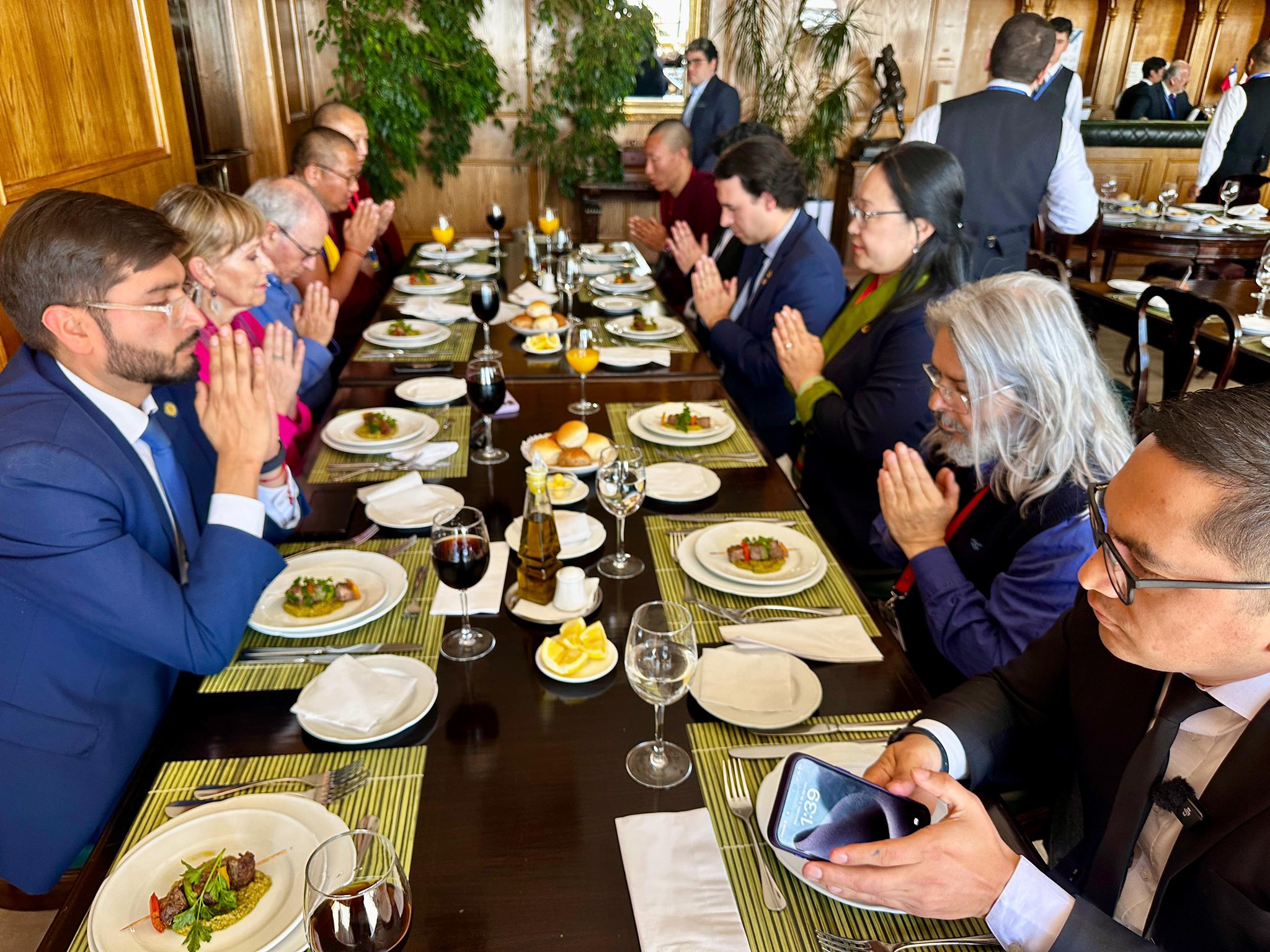 在国会大厦举行的工作午宴上,诺增卓玛部长与多名智利议员进行了交流,与会者包括弗拉多·米洛塞维奇议员(Deputy Vlado Mirosevic Verdugo)、托马斯·赫希议员(Tomás Hirsch)、安娜·玛丽亚·加兹穆里议员(Ana María Gazmuri)、路易斯·马拉·瓦伦苏埃拉议员(Luis Malla Valenzuela),以及智利国会支持西藏小组主席费尔南多·萨利纳斯议员(Fernando Salinas)。部长感谢议员们对西藏自由事业的持续关注与支持,并介绍了当前西藏境内的局势,尤其谈及达赖喇嘛尊者转世问题的重要性及国际社会所肩负的责任。她向与会嘉宾赠送了达赖喇嘛尊者九十华诞纪念徽章和《为无声者发声》一书,以及尊者的语录卷轴。