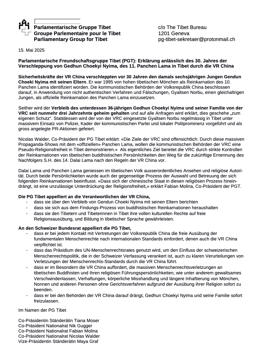 瑞士国会议员们在一份联合声明中严厉谴责了中国政府于 1995 年 5 月 17 日当天,将年仅六岁的第十一世班禅喇嘛强行带走,此后再未公开露面的这一持续三十年的侵犯人权行为。