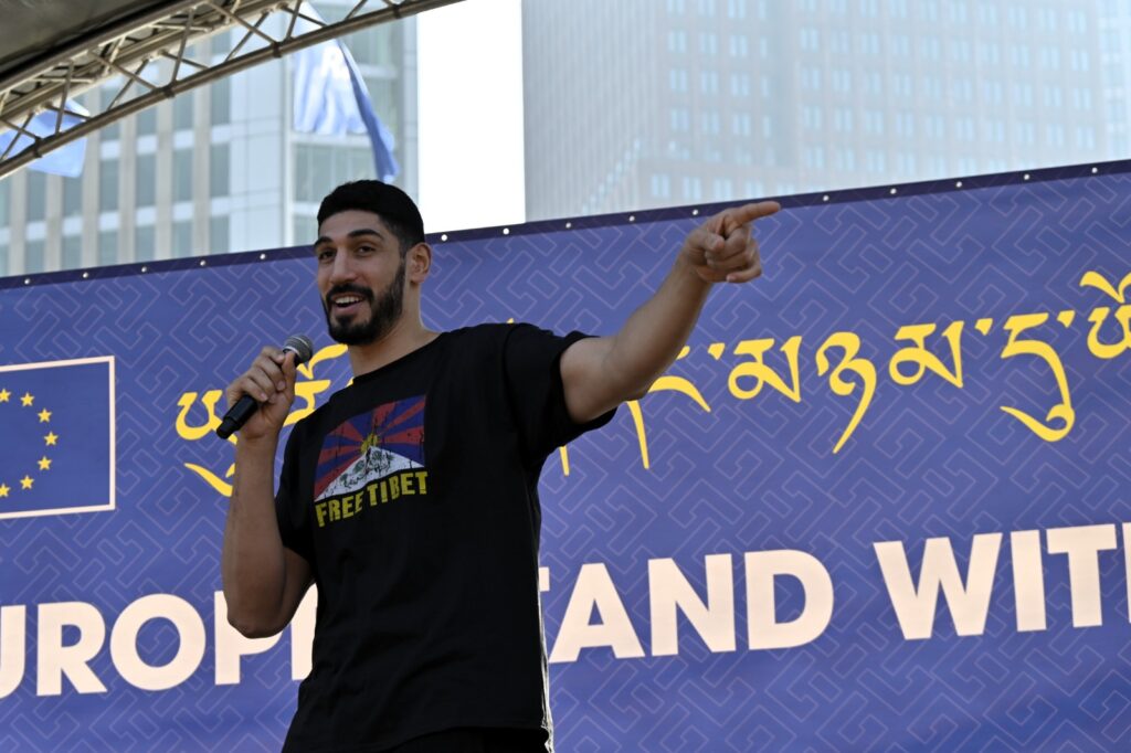 美国著名篮球运动员埃内斯·坎特在集会活动上发表演讲   2025 年 3 月 10 日 照片/驻布鲁塞尔办事处提供