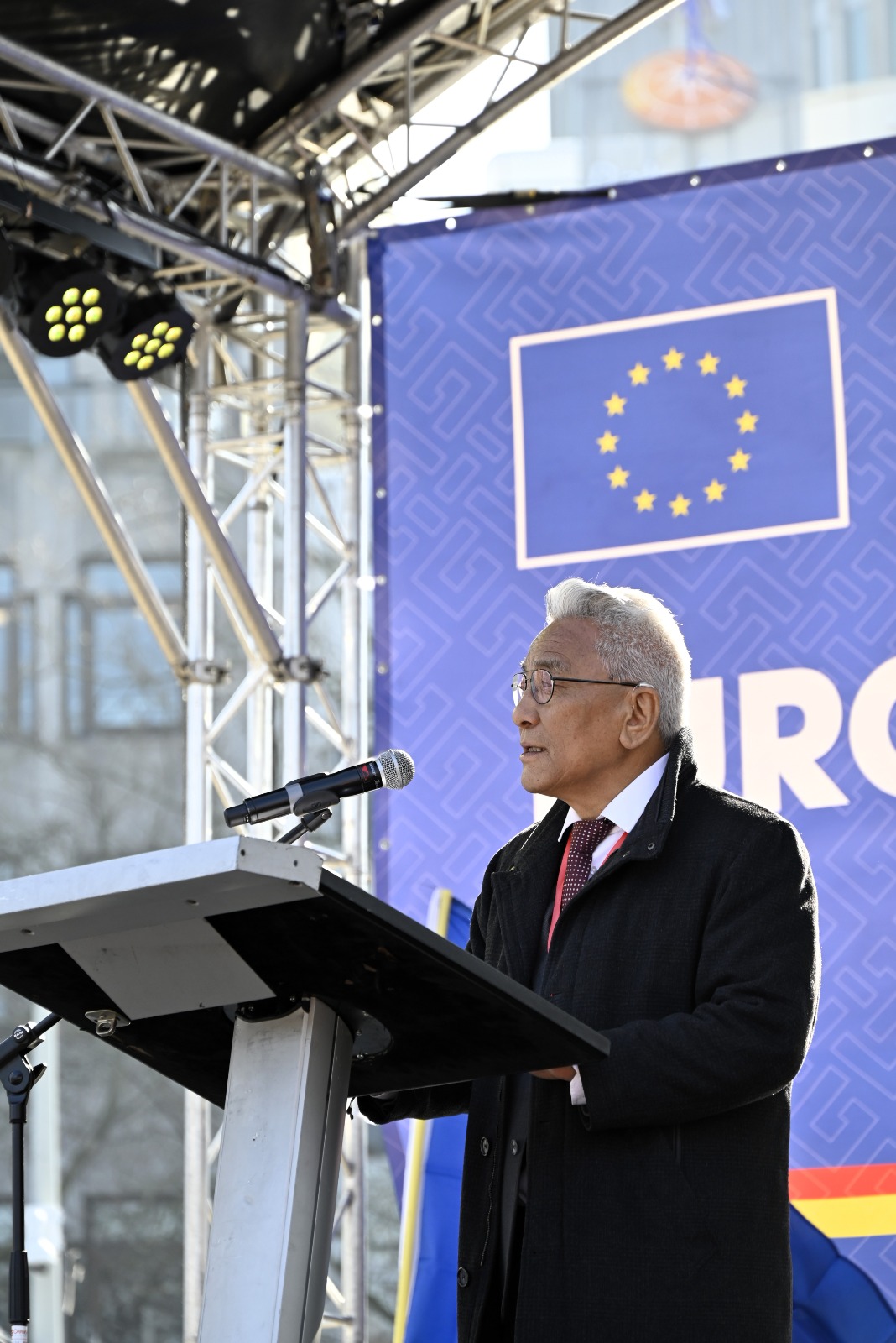 好莱坞著名演员理查德·基尔在集会活动上发表演讲    2025 年 3 月 10 日 照片/驻布鲁塞尔办事处提供