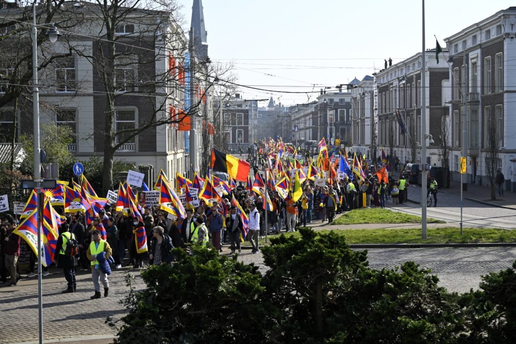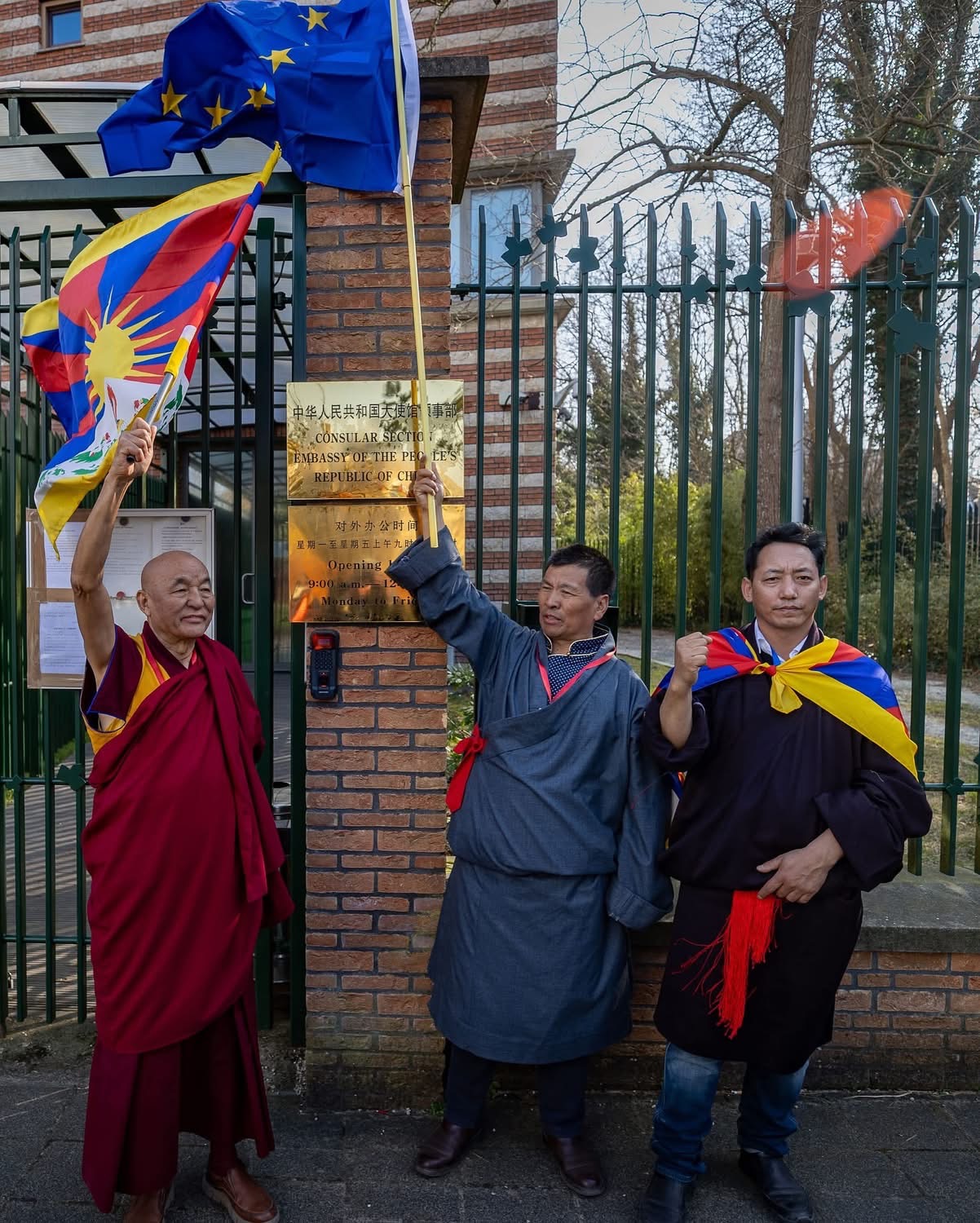 抗议民众在中国驻荷兰大使馆前挥舞西藏国旗  2025 年 3 月 10 日 照片/驻布鲁塞尔办事处提供